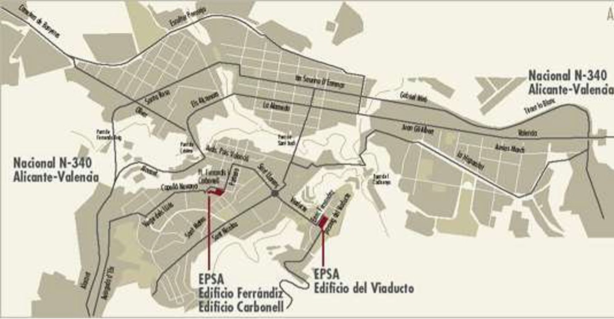 Localización de los diferentes edificios de la UPV en la ciudad de Alcoy