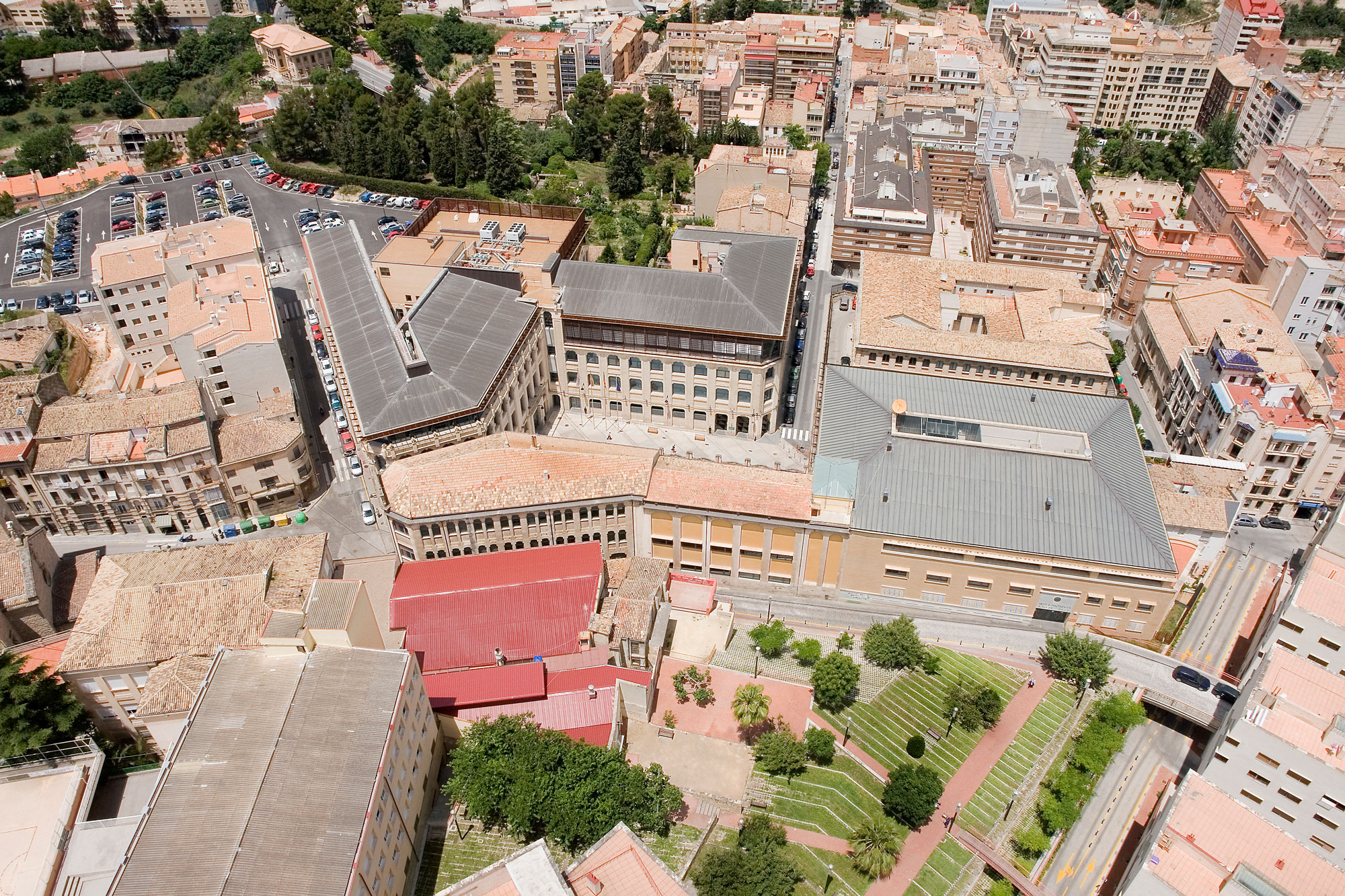 Vista cenital actual de la plaza de Ferrándiz y Carbonell, con los Edificios Ferrándiz (derecha) y Carbonell (izquierda), y el barrio de la Sang al fondo.