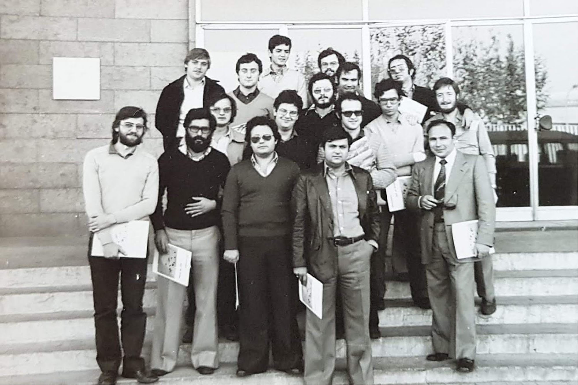 Salvador Bresó en primera línea como profesor ayudante de prácticas de Justo Nieto (en primera línea a la derecha) con alumnos de 3.º de industriales en la puerta de la SEAT de Barcelona. También están en la foto Javier Fuenmayor (arriba del todo) y delante de él a su derecha Fernando Romero, que sería rector de la Jaume I.