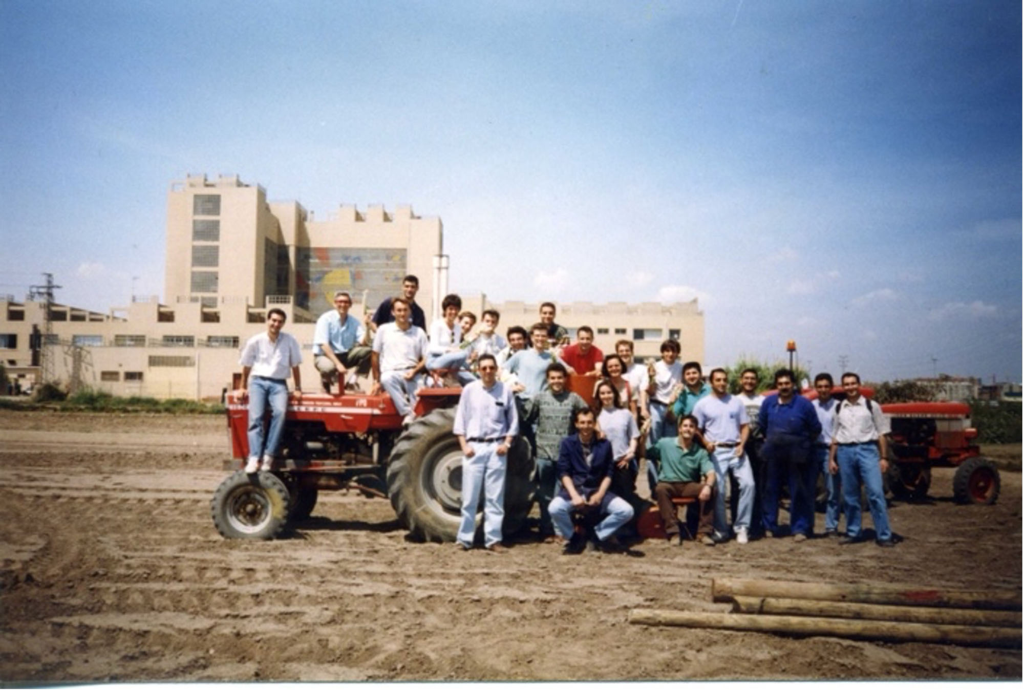 Grupo de profesores, técnicos y alumnos en una práctica de labores con tractor (Campus de Vera, 1995)