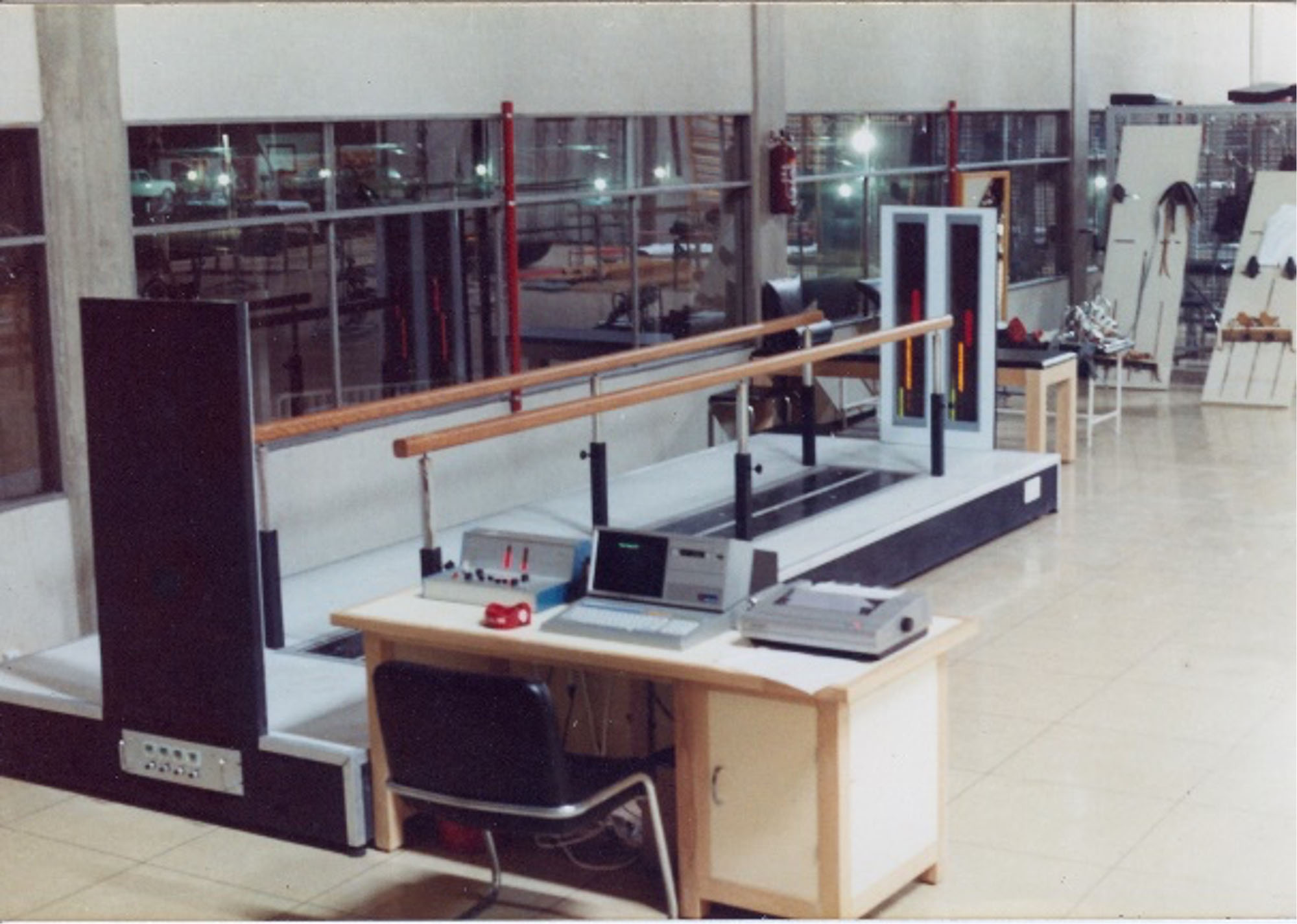 Plataforma para el análisis y rehabilitación de la marcha instalada en la Mutua de Accidentes de Zaragoza en 1982.
